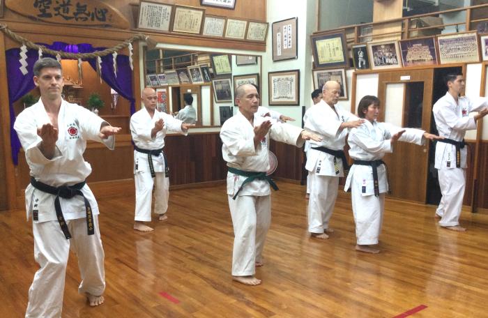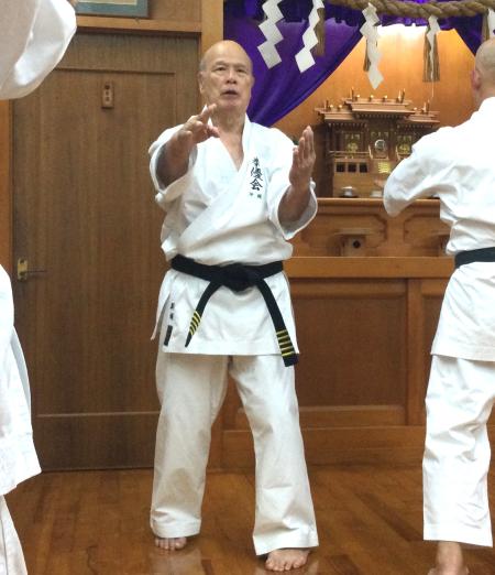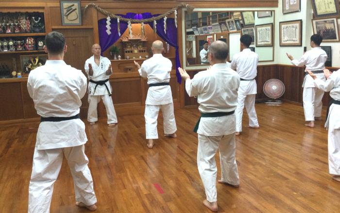 この日も師範の新城会長が道場内を回りながら、背中を叩いたり、腹を突いたり、下段(大腿部)や膝裏に蹴りを入れながら、それぞれの体の状態をチェックした。本来の上地流はこのチェックを〝裸体〟で行うというが、夏場は汗が板張りの上に飛び散るのでやむなく空手着を着たまま行っているとの説明だった。