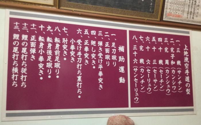 休憩のあと、型を行う。上地流の型は現在、8種類。サンチンを基本に、サンセーリュウまで他に7種類ある。上地流の草創期は、サンチン、セーサン、サンセーリュウの3種類を上地完文が中国から持ち帰ったため当初は3つしかなかったが、演武会などで種目が少なすぎるなどのニーズから、その後、門弟のなかで5種類が創作された経緯がある。
