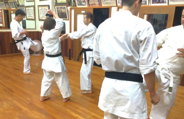 そのかわり、冬場は上半身を脱いで行う。会長が一人一人の体を叩いて確認したあと、サンチン立ちからの「受け⇒正面蹴り(前蹴り)」の連続動作を行った。さらに同じ動作を2人1組の対面で行う(約束組手)。