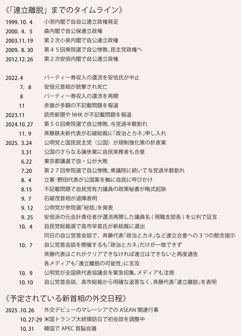 一方で、今回の連立離脱をめぐって、さまざまな憶測や不正確な情報も出回っている。既に各方面で個々に指摘の声は上がっているが、今後の記録として、ここでタイムラインを整理しておきたい。何が起きたのか、なぜ公明党がこのタイミングで離脱に踏み切ったのか、理解する一助になれば幸いである。
