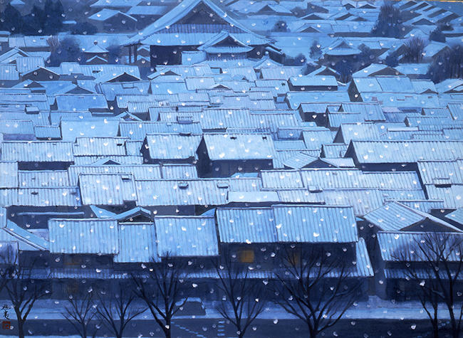 私がとりわけ胸を打たれたのは、大晦日の京都を描いた『年暮る』である。魁夷の作品にはどれも人物が登場しない。現在の京都ホテルオークラの場所、当時の京都ホテルの屋上から東山の方角に向かって川端御池の街並みを描いた『年暮る』は、深々と降る雪明りの中でただ木造の家々の屋根だけが並んでいる。
